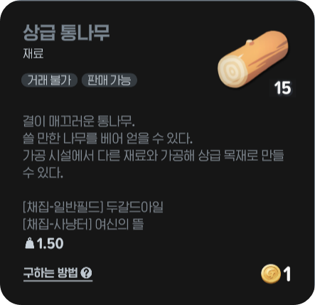 | 상급 목재 | 상급 통나무 15개 | 목재+ 3개 | 나무 진액 8개 |