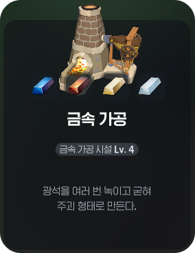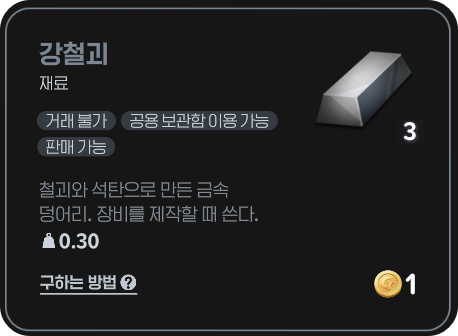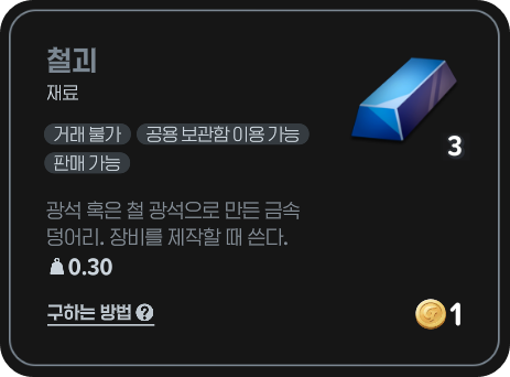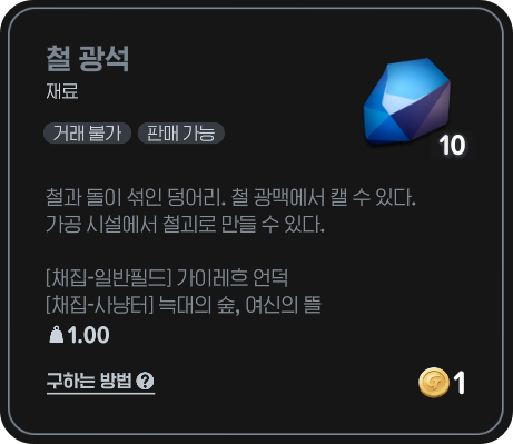 | 철괴(철 광석) | 철 광석 10개 | - | - |