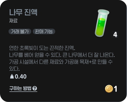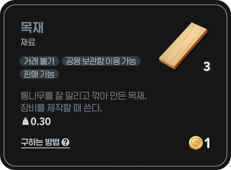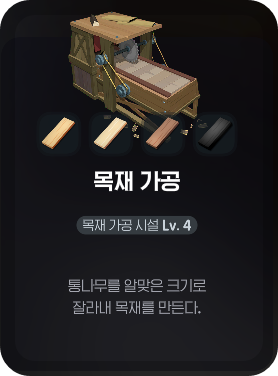 | 목재+ | - | 목재 3개 | 나무 진액 4개 |