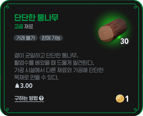 2. 크래프팅(K) > 가공 > 목재 가공 > 단단한 목재 > 단단한 통나무 > 구하는 방법 > 나무 베기 클릭