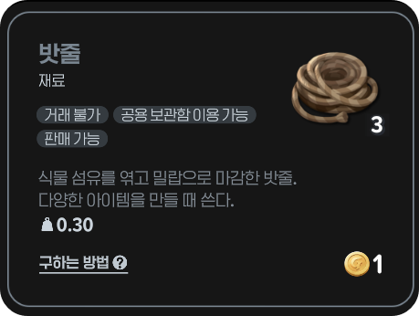 | 단단한 목재 | 420개 | 두꺼운 옷감 | 800개 | 밧줄 | 500개 |