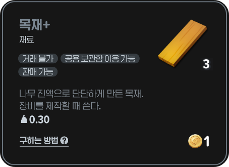 - 목재+ 구하는 방법: https://manduhunter.tistory.com/18