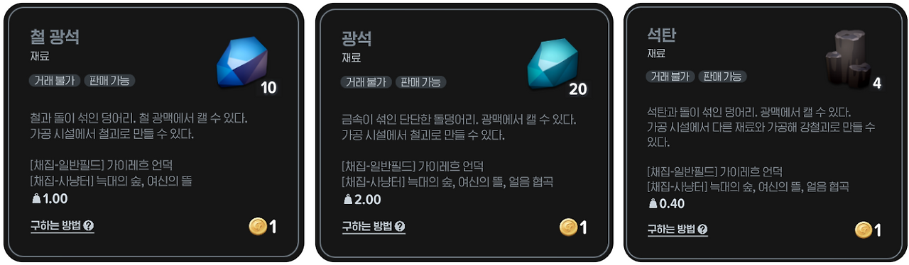 | 철괴(철 광석) | 철 광석 10개 | - | - |