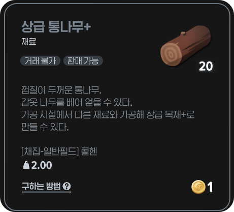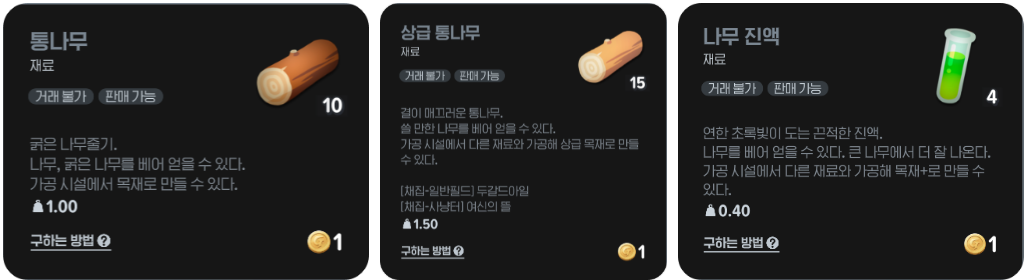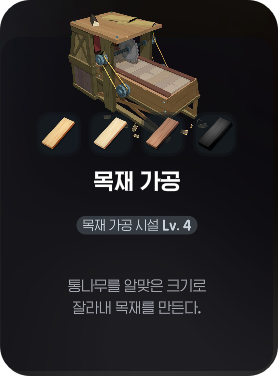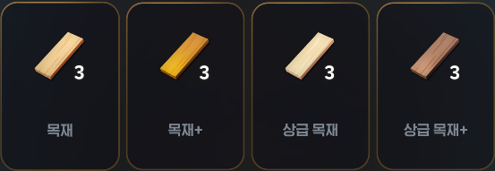 | 상급 목재 | 상급 통나무 15개 | 목재+ 3개 | 나무 진액 8개 |