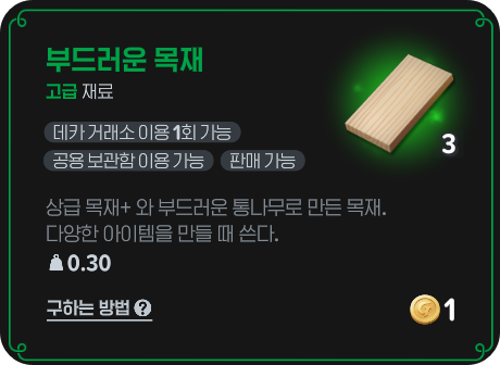| 부드러운 목재 | 부드러운 통나무 30개 | 상급 목재+ 15개 | 나무 진액 30개 |