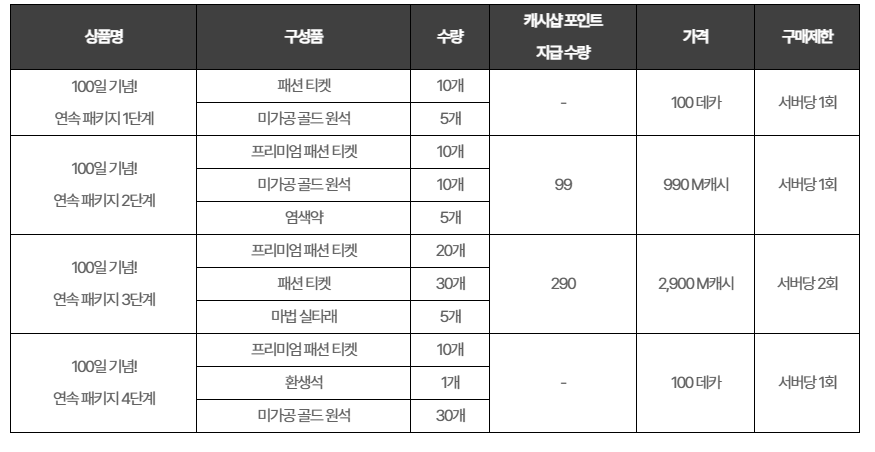 - '100일 기념! 연속 패키지'(100데카) 구성: 패션티켓, 골드