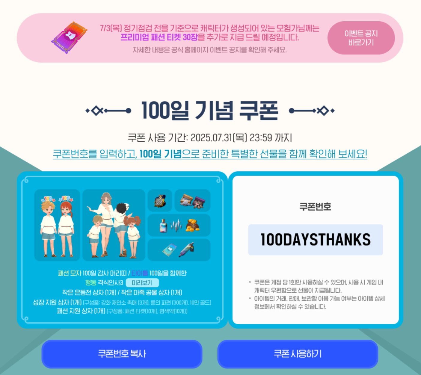 - 100일 감사 쿠폰 번호: 100DAYSTHANKS