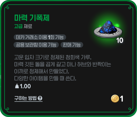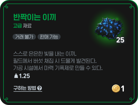 - 마력 기폭제 가공 재료: 마력 깃들 돌, 마나 허브, 반짝이는 이끼