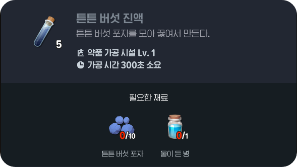 - 튼튼 버섯 진액 가공 재료: 튼튼 버섯 포자, 물이 든 병