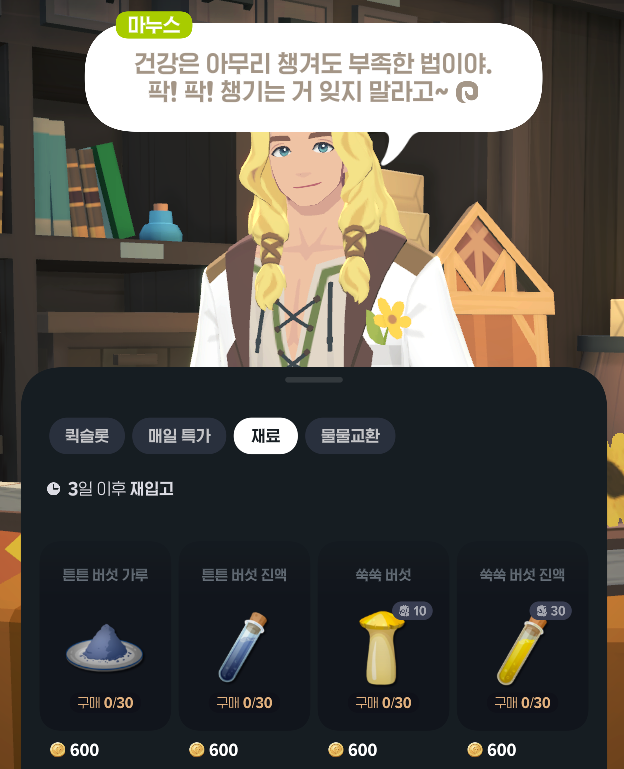 | 상급 목재+ | 300개 | 마력 기폭제 | 500개 | 튼튼 버섯 진액 | 2,250개 |