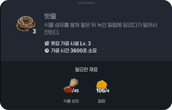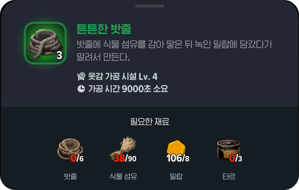 | 단단한 목재 | 300개 | 두꺼운 옷감 | 800개 | 튼튼한 밧줄 | 500개 |