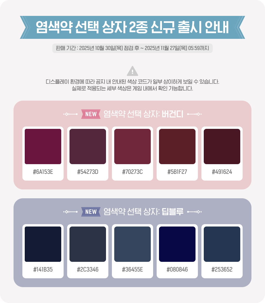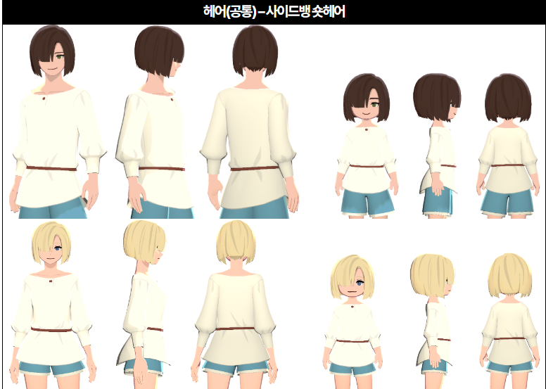 > '레이어드 믹스 숏헤어(남)", 트윈번 믹스 헤어(여)'는 각각의 패키지* 구매 시 헤어 쿠폰 아이템을 사용한 이후 환생 시에 정해진 색상 조합 내에서만 선택 가능